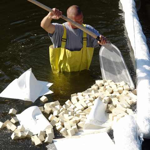 Cuburi absorbante care absorb hidrocarburile si produsele petroliere de pe suprafata apei cu succes si pot fi recuperate foarte usor din cauza formei.