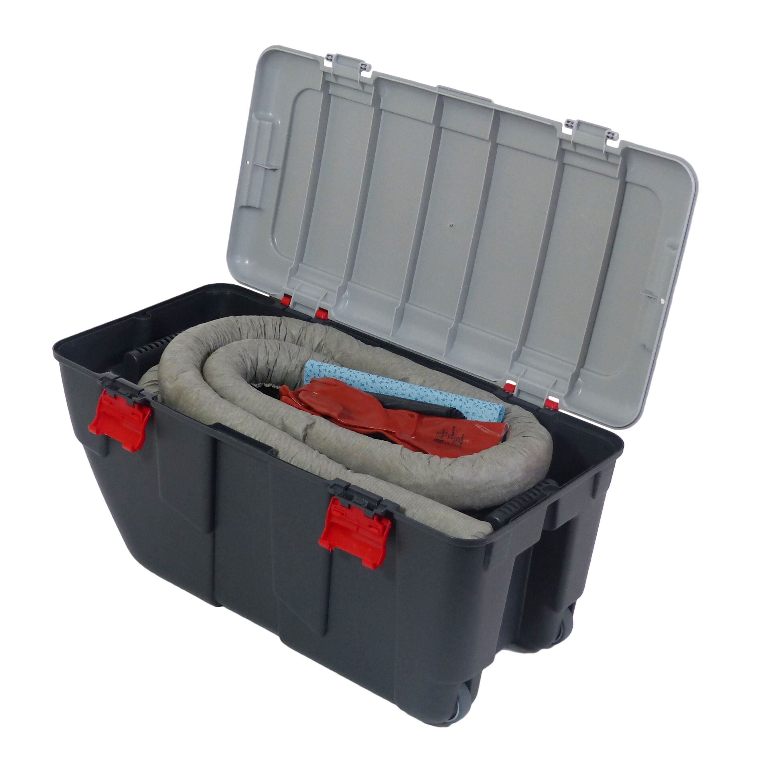 Kitul este compus dintr-o cutie cu roti, capac demontabil si produsele destinate absorbtiei lichidelor.